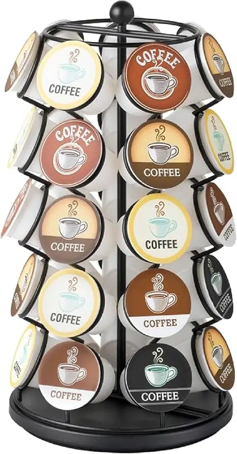The Nifty K Cup Holder is a compact and stylish coffee pod organizer designed to hold up to 35 K-Cups. Made of strong metal with a sleek black powder-coated finish, this carousel spins a full 360 degrees on its Lazy Susan base, making it easy to find and pick your favorite coffee flavor. It fits perfectly on your kitchen counter, office coffee bar, or dorm room table without taking up too much space. Measuring just 13 inches tall and 7 inches wide, it keeps your area neat and organized. The holder requires no assembly, is easy to clean by hand, and is built to last.